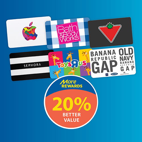For a limited time, redeem gift cards from your favourite brands in-store using 20% fewer points.